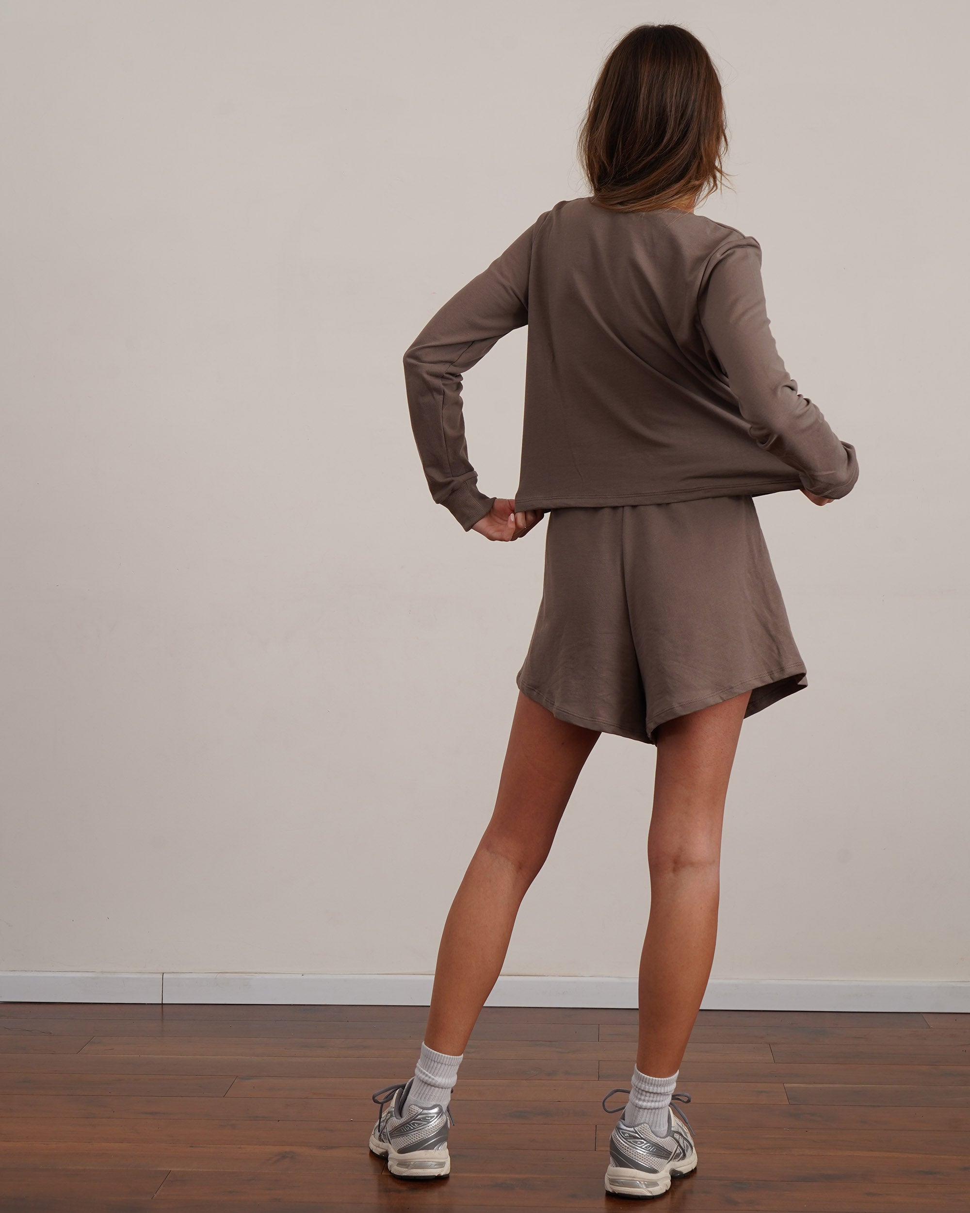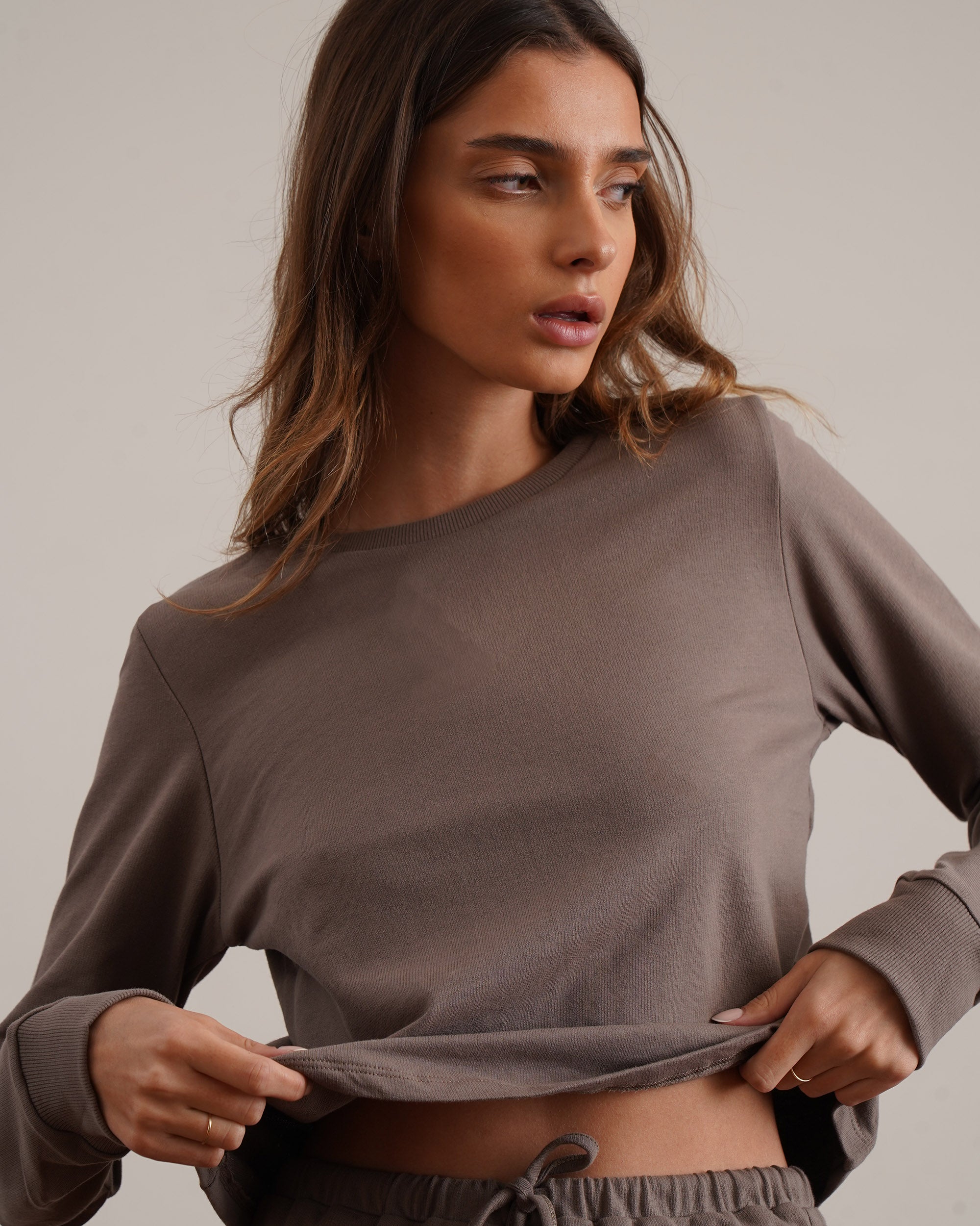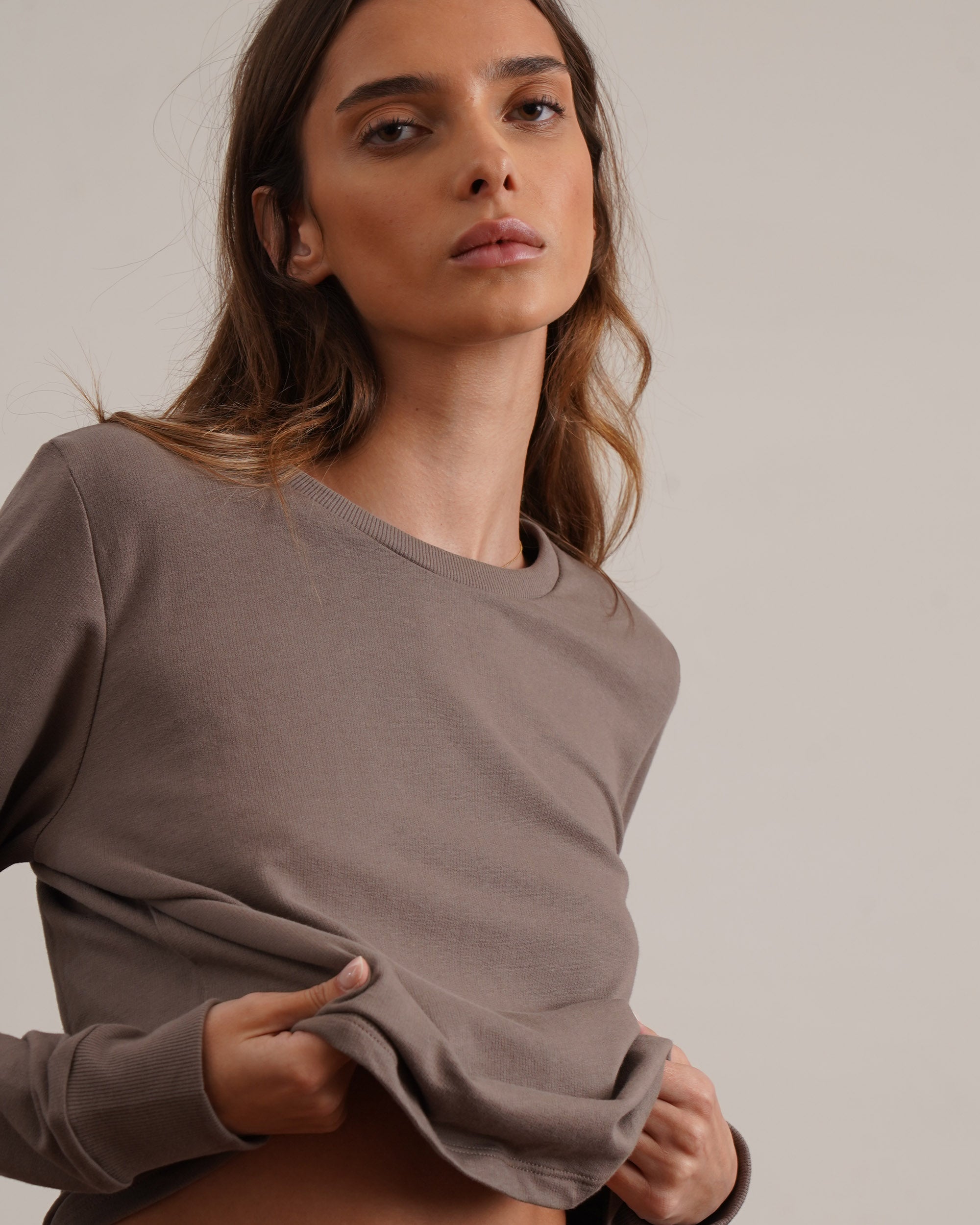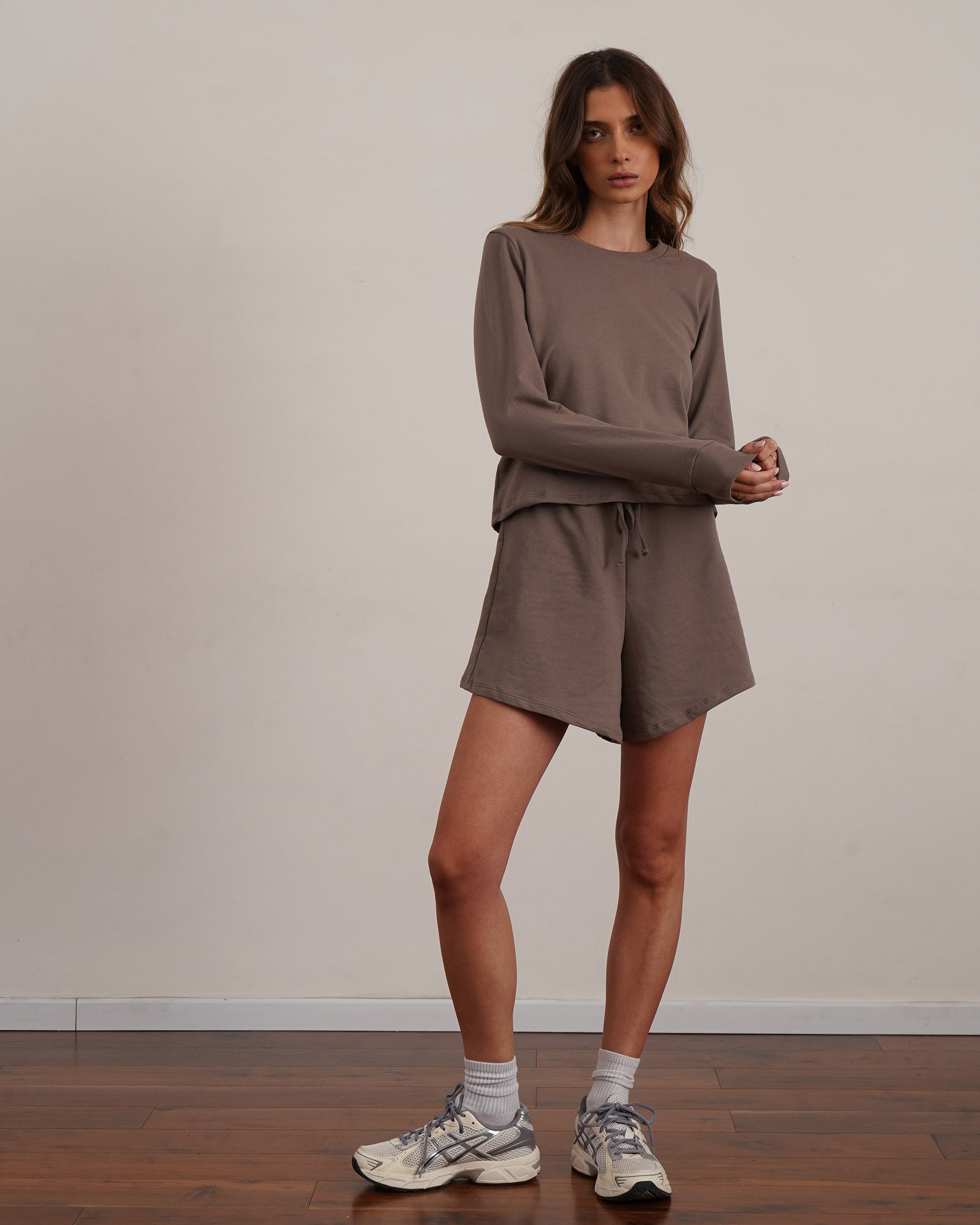 Lightweight 180g French Terry long sleeve top in a flattering feminine boxy style made from soft breathable 100% cotton.