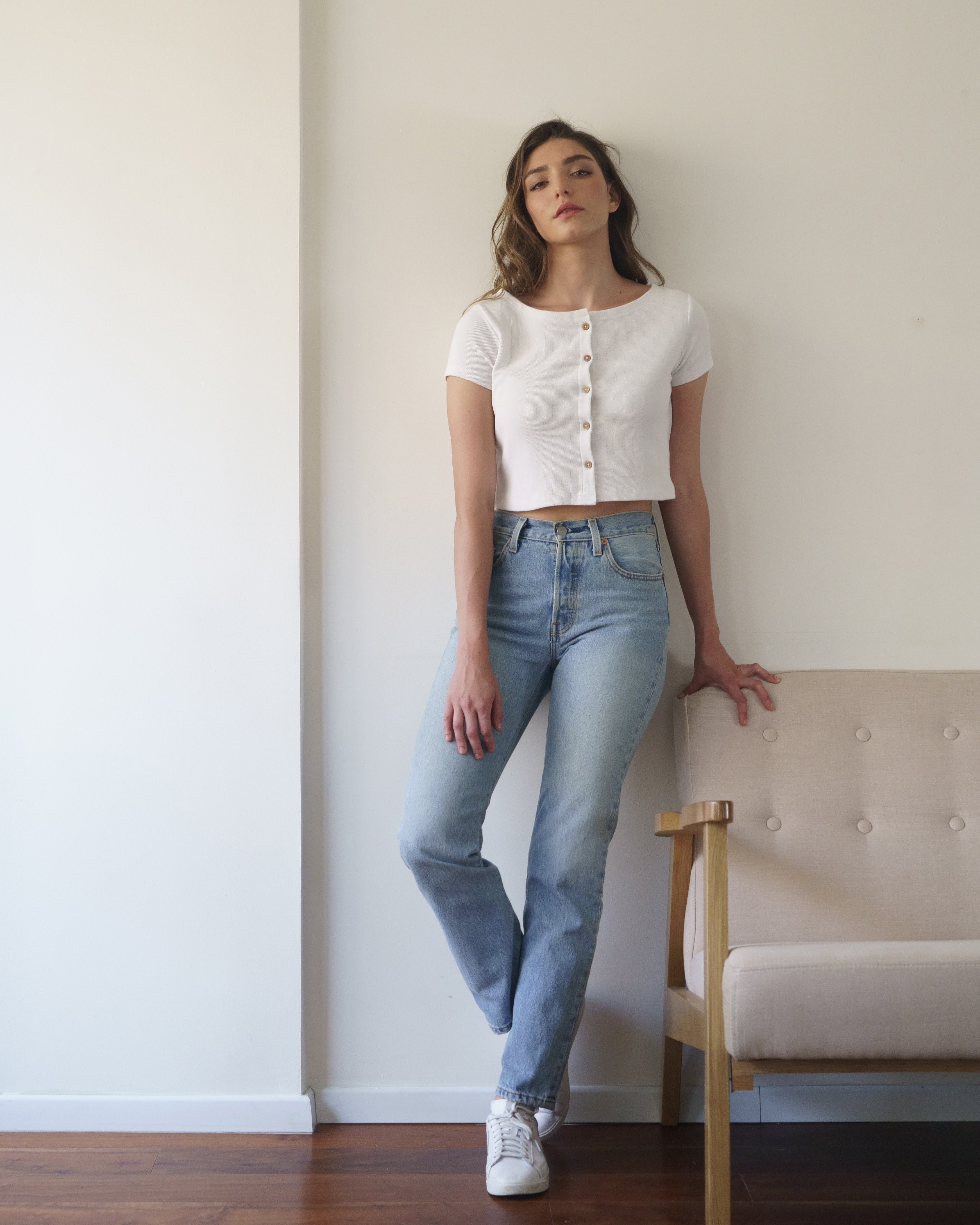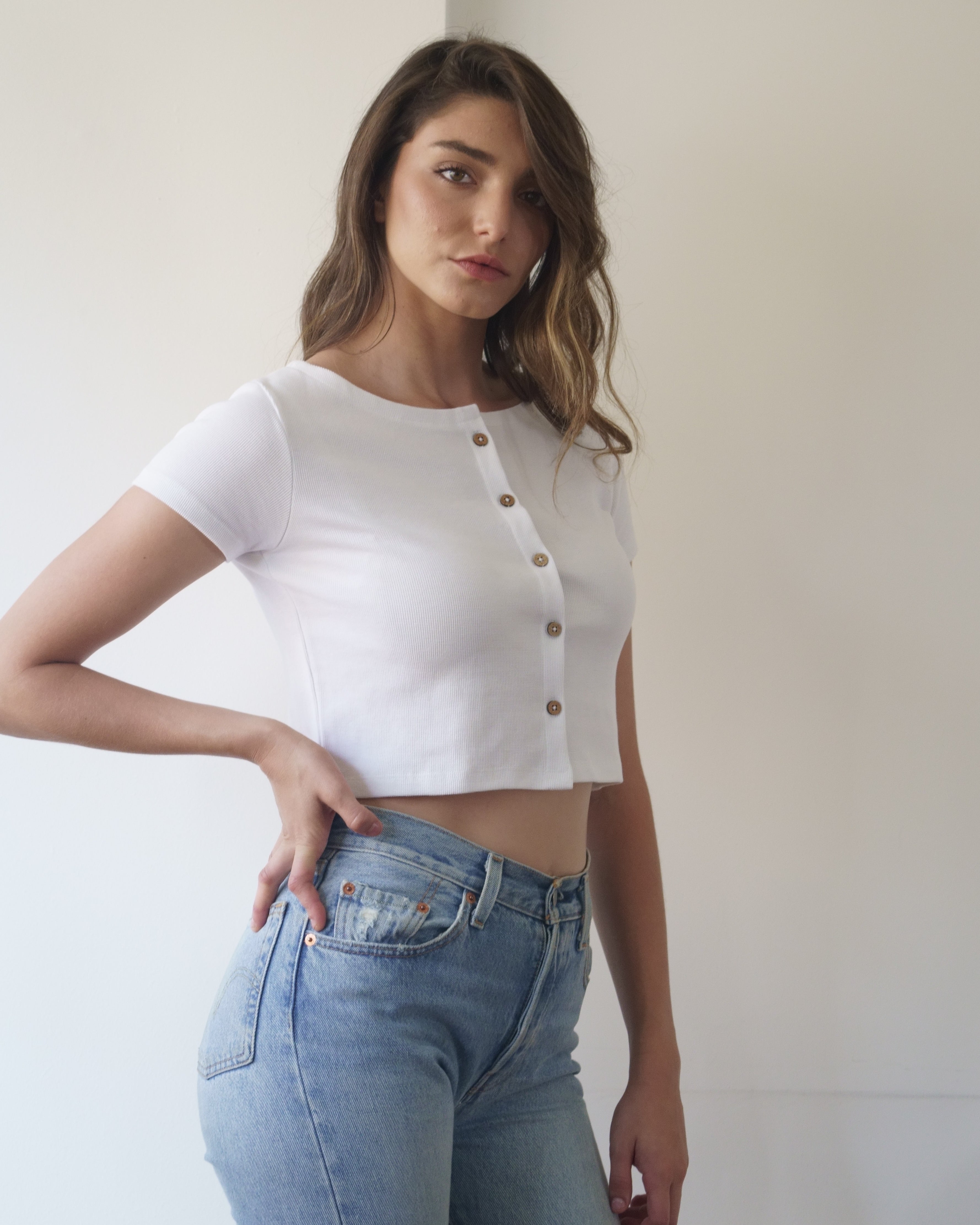 Women's cropped style button t-shirt made from high quality 240 GSM waffle knit cotton.