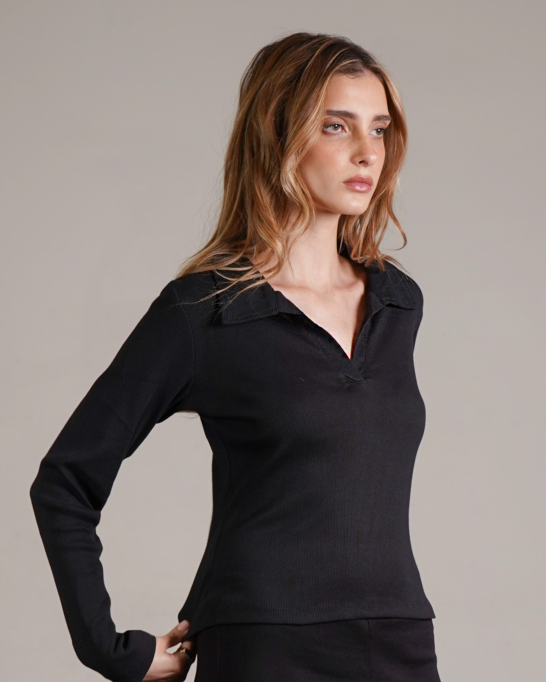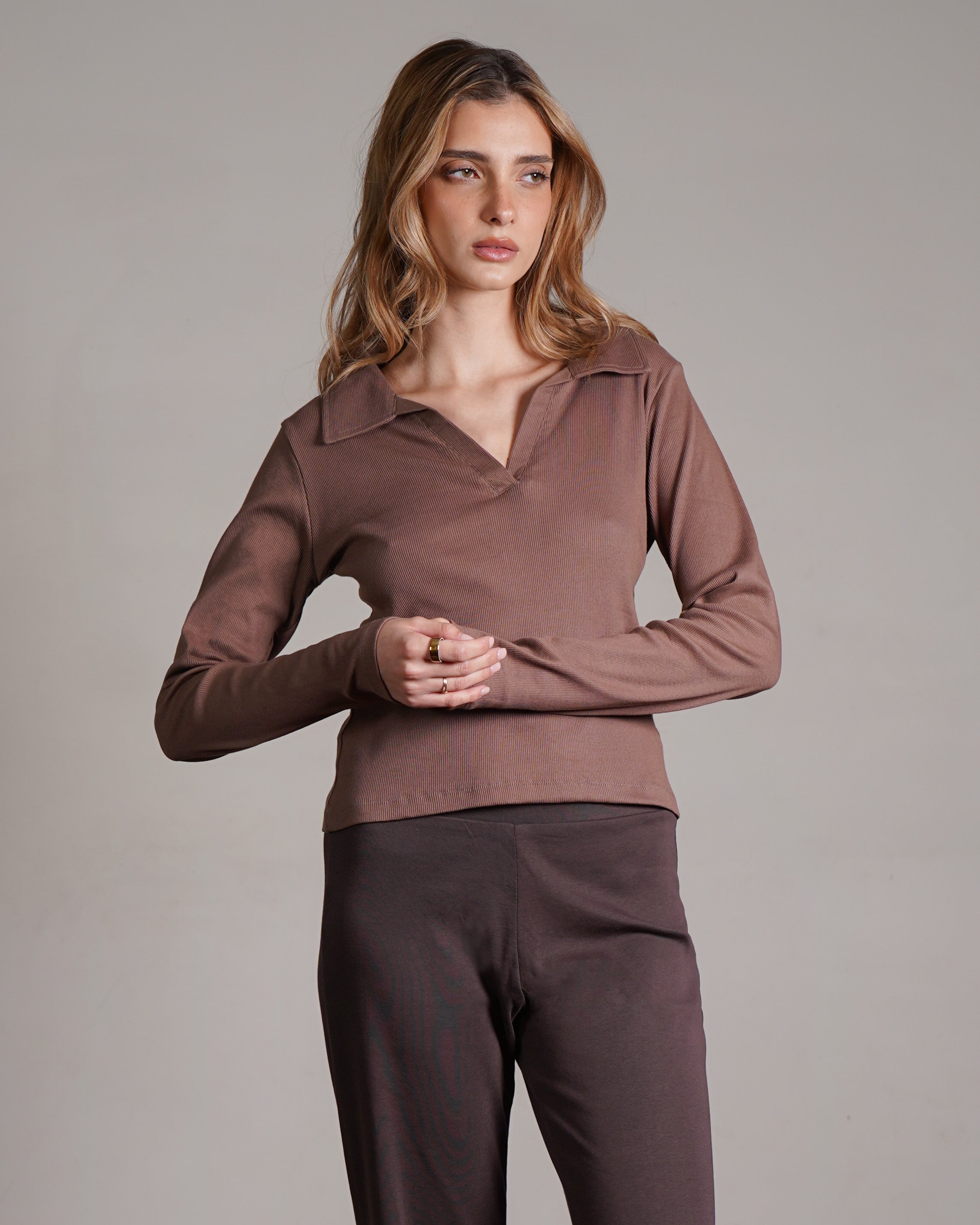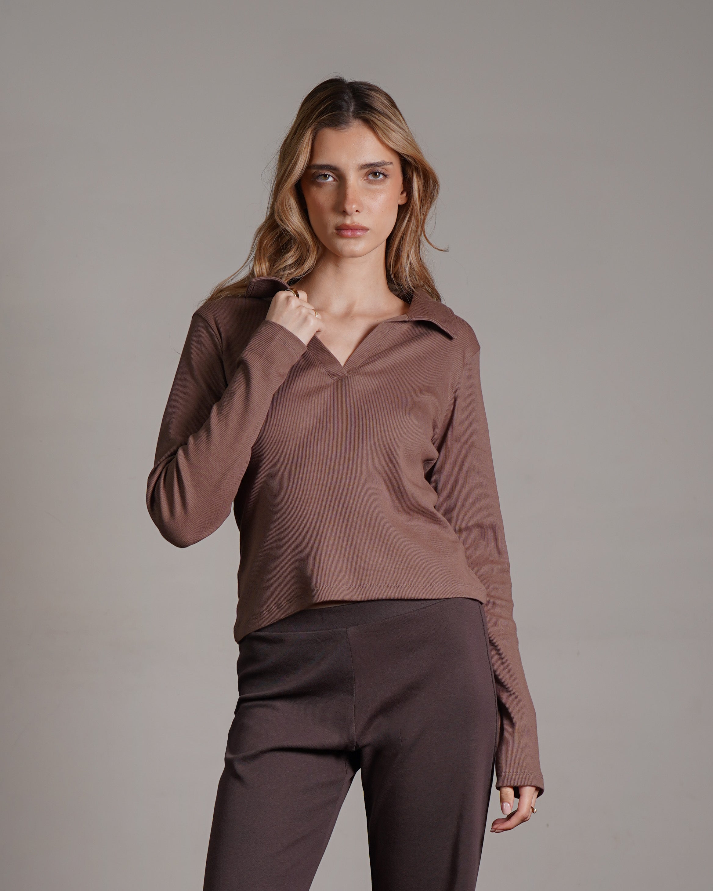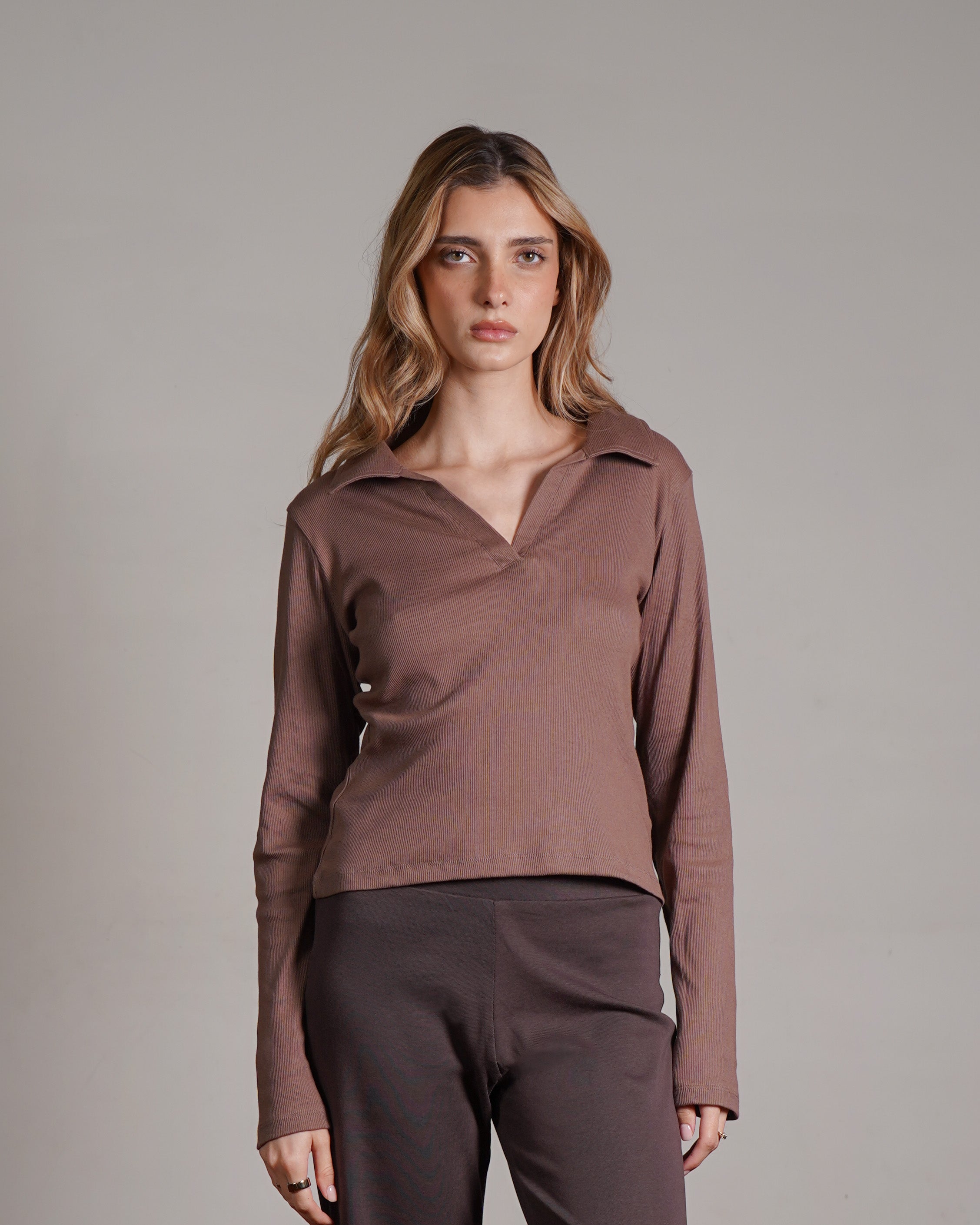 טופ ריב מכותנה עם צווארון. מיוצר בהודו מבד ריב רך מ־100% כותנה, בצביעה ייחודית. ניתן לשלב אותו עם סטים לאימון או ללבוש ביום־יום ואף למשרד. פריט בסיסי ורב־שימושי לארון, העשוי מהבד הנושם ביותר.