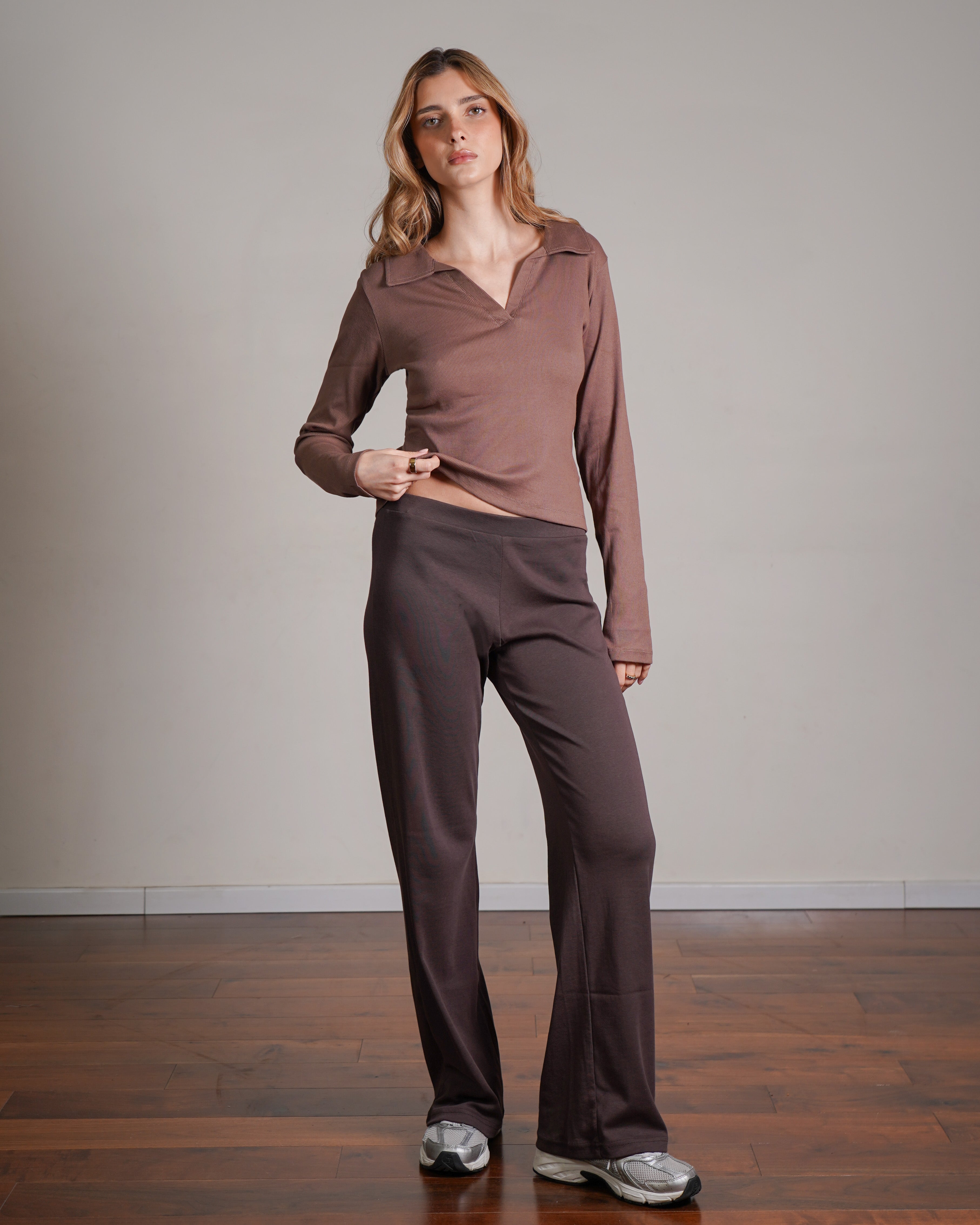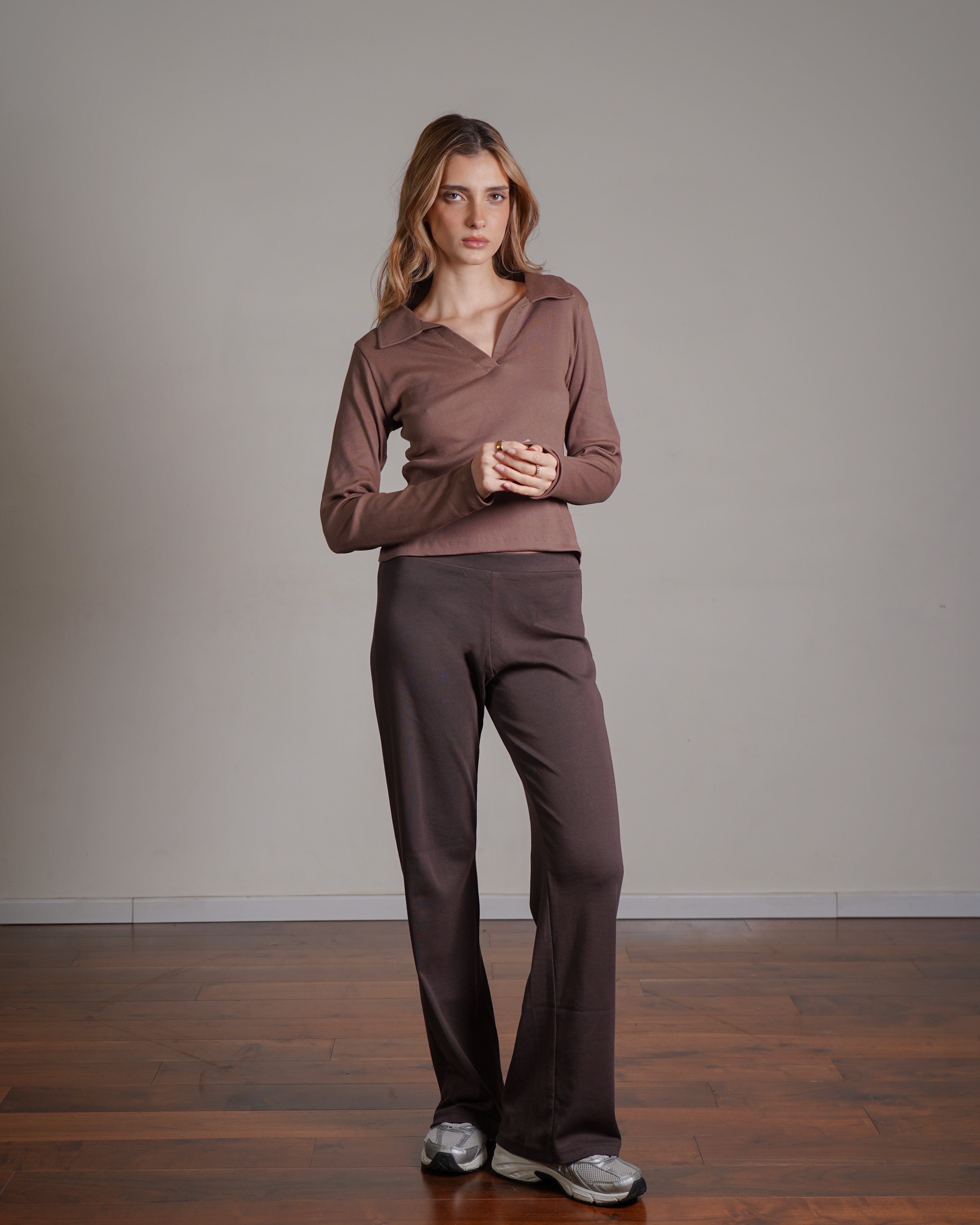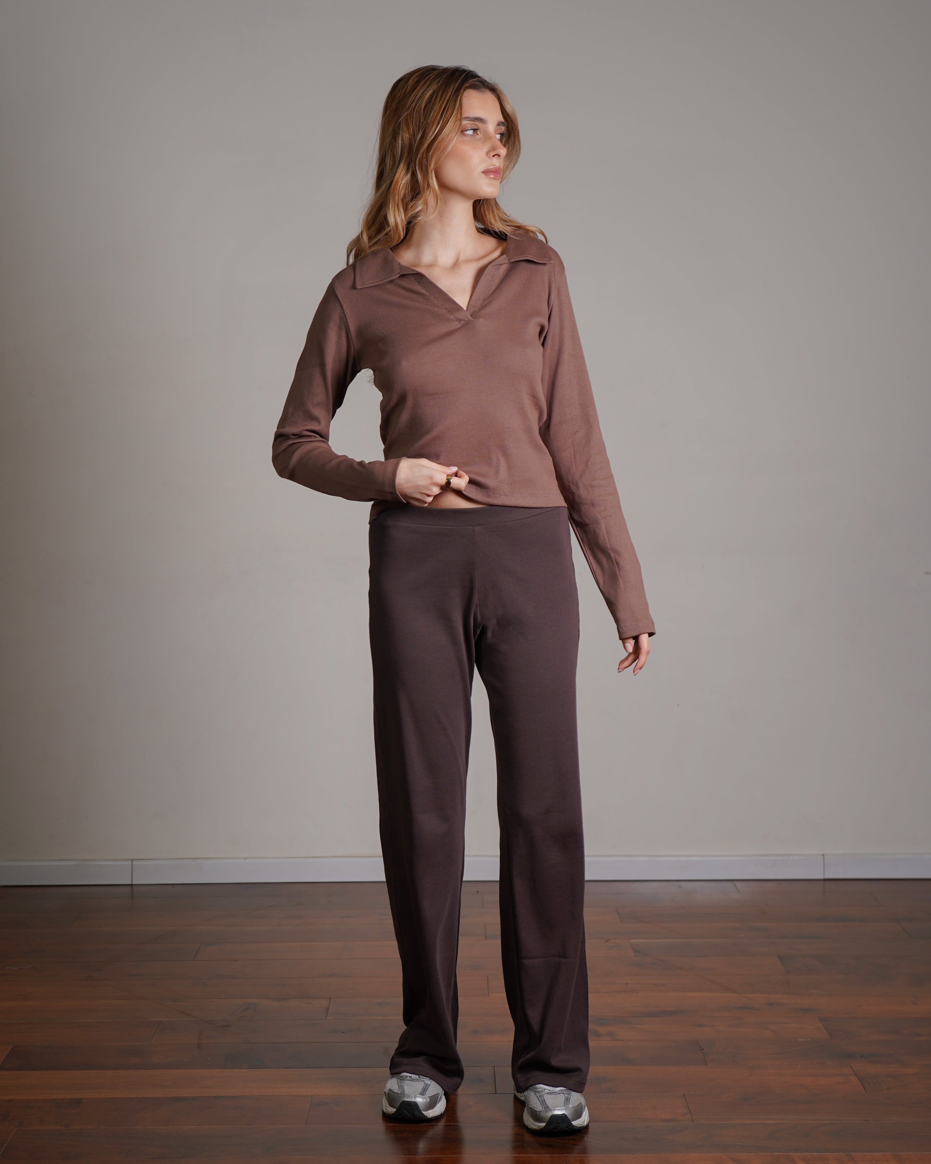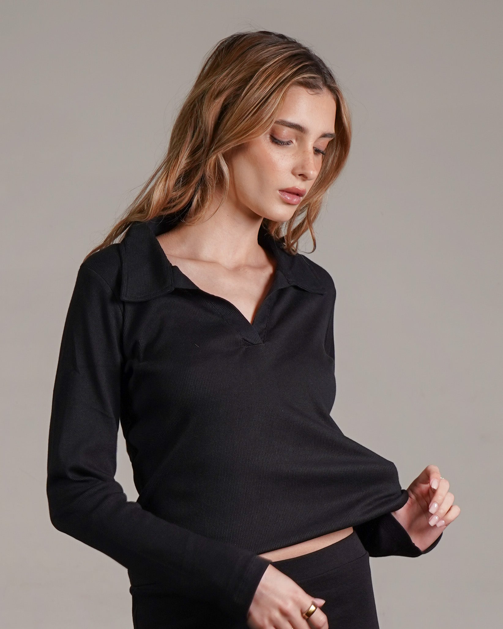 טופ ריב מכותנה עם צווארון. מיוצר בהודו מבד ריב רך מ־100% כותנה, בצביעה ייחודית. ניתן לשלב אותו עם סטים לאימון או ללבוש ביום־יום ואף למשרד. פריט בסיסי ורב־שימושי לארון, העשוי מהבד הנושם ביותר.